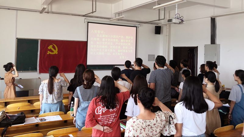 6月26日,经济系学生一支部、二支部在汇文书院B227举行新党员入党宣誓暨老党员重温入党誓词仪式,全体学生正式党员和预备面对党旗庄严宣誓,用铮铮誓言表达了对党忠诚,为了共产主义事业奋斗终身的决心。